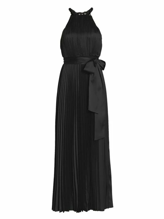 Alice + Olivia’s Alycia maxi dress is crafted of shiny pleated satin. This halterneck style is adorned with a self-tie belt and a chain-link detail at the neck.