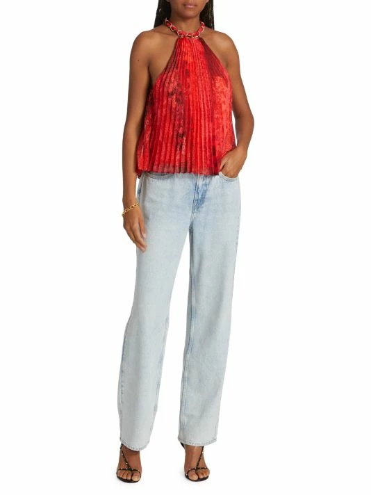Alice + Olivia’s Alycia top is crafted of pleated chiffon with a muted print. This flowy piece is adorned with a chain-link detail at the neck.