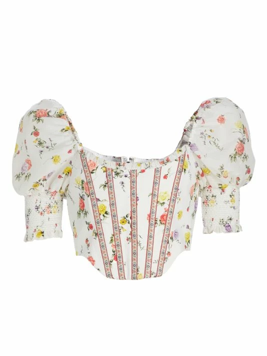 Alice + Olivia’s Audie corset top is adorned with a floral print and puff sleeves.