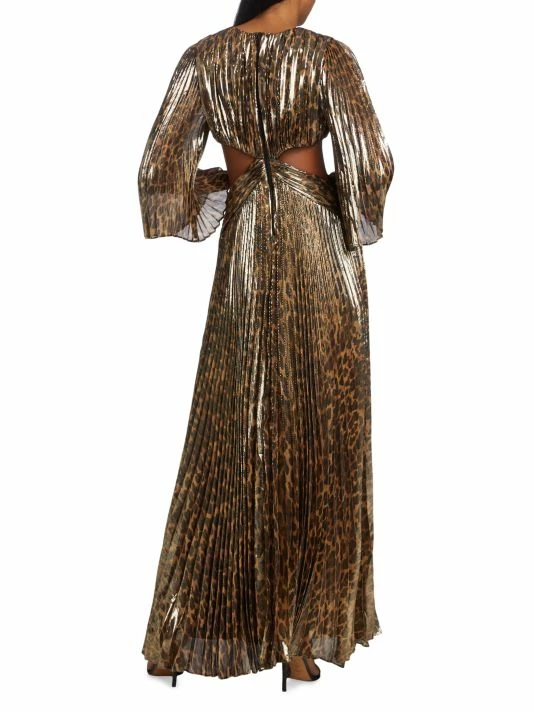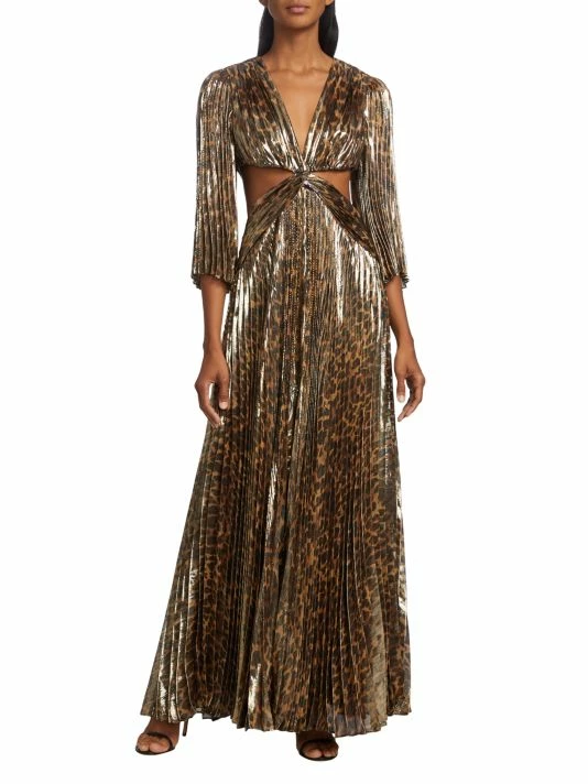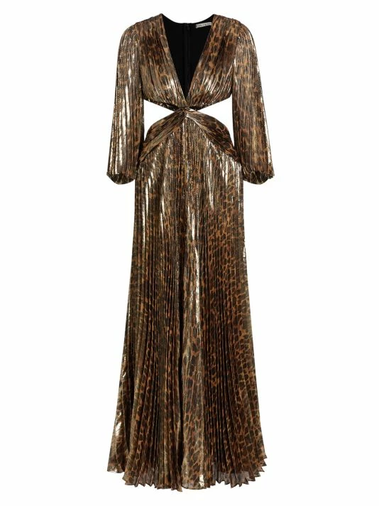 The Bahama maxi dress by Alice + Olivia is made of sparkling metallic fabric with a cutout waistline.