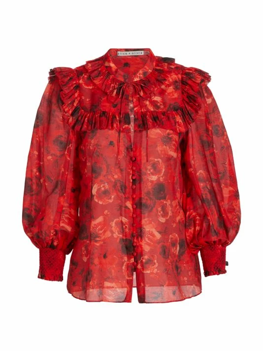 Ruffles trim Alice + Olivia’s Bette top, crafted from a lightweight blend of cotton and silk with a vibrant floral print.