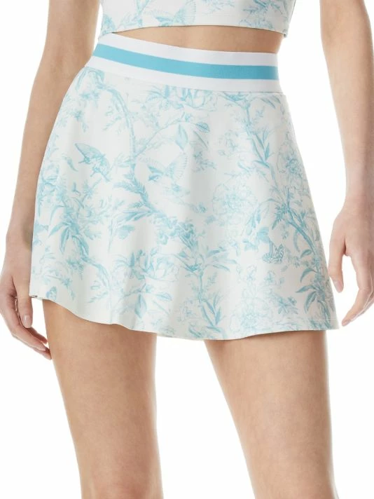 Cut in a trapeze silhouette, Alice + Olivia’s Blaise miniskirt is elevated by a striped banded waist and contrast painterly prints.