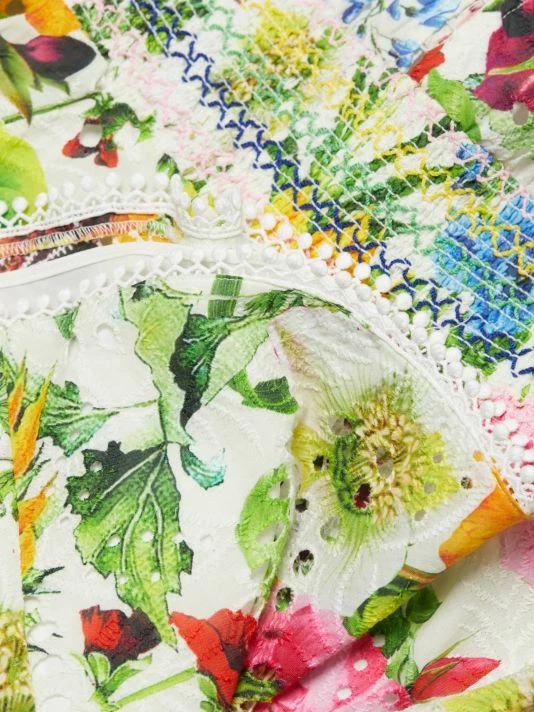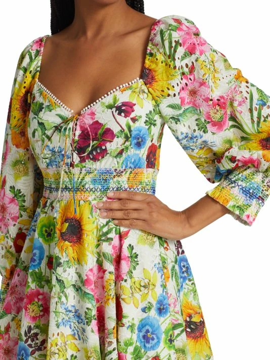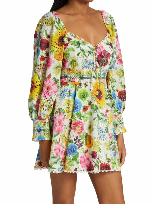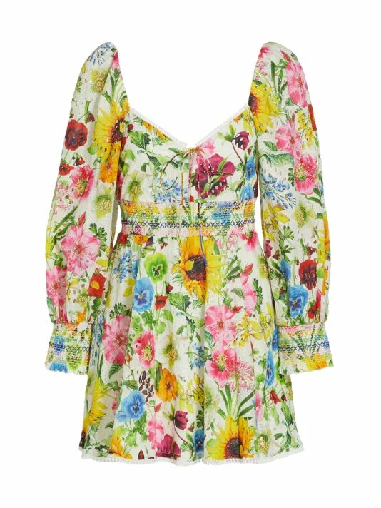 Brilliant florals cover this stretch mini dress, designed with smocked detailing for shape and whimsical pom-pom trim.
