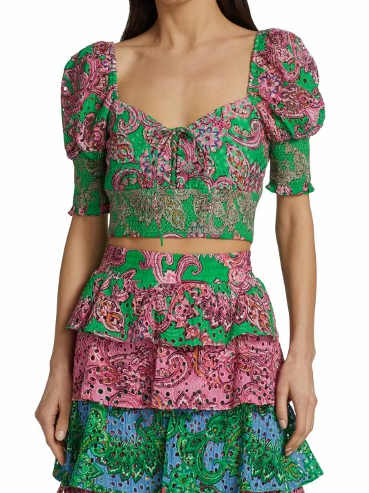 Vibrant paisley print covers this cotton eyelet top, designed with a cropped fit and smocked trim.