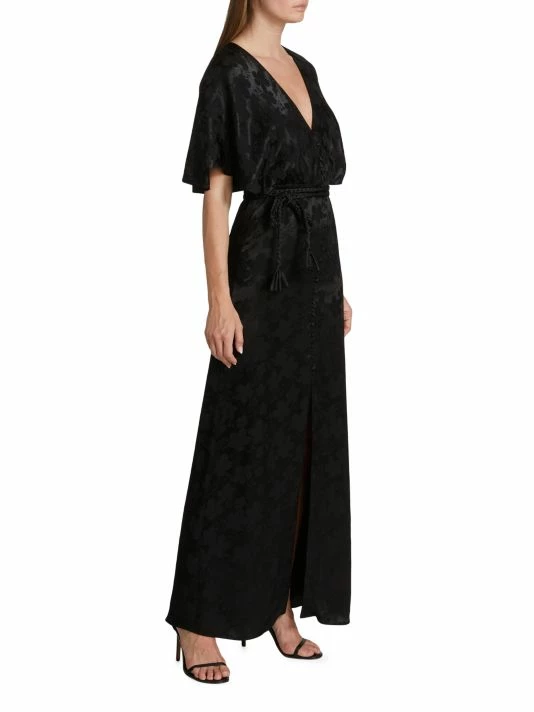 Alice + Olivia’s Davida maxi dress is crafted of satin jacquard, featuring a V-neck, flutter sleeves, and a braided wrap belt at the waist.