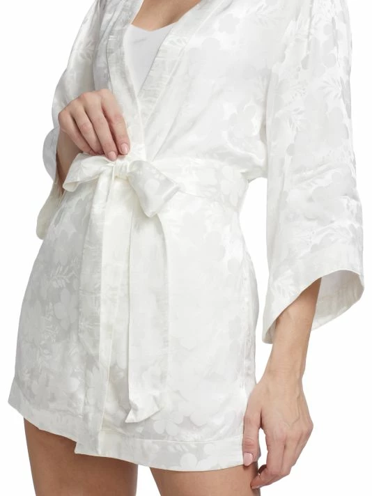 Made of floral textured satin, the Domino robe by Alice + Olivia is designed with breezy long sleeves.