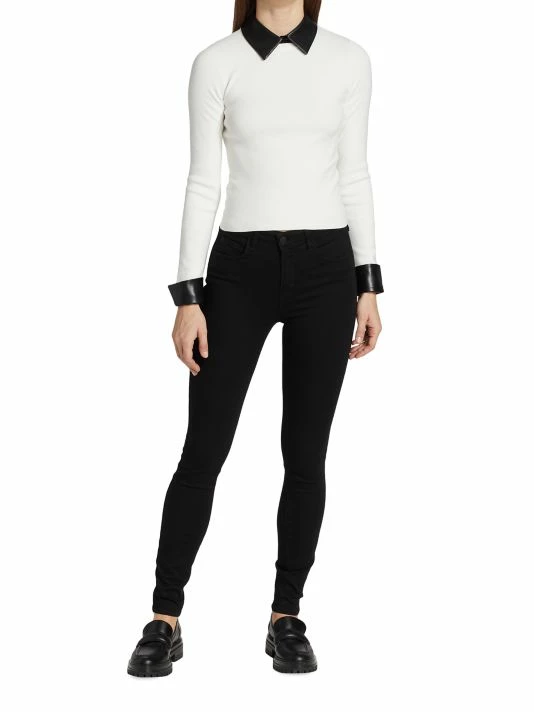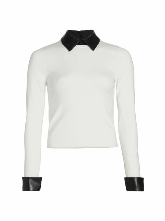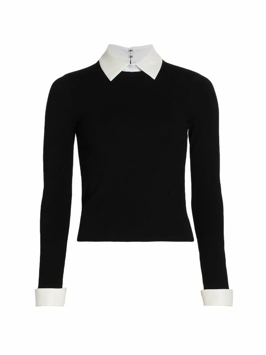 This sweater is designed with a layered look, with a collared shirt layered under a crewneck sweater.