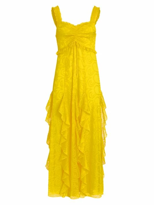 Swirly jacquard lends style to Alice + Olivia’s empire-waist dress, designed with playful ruffled trim.