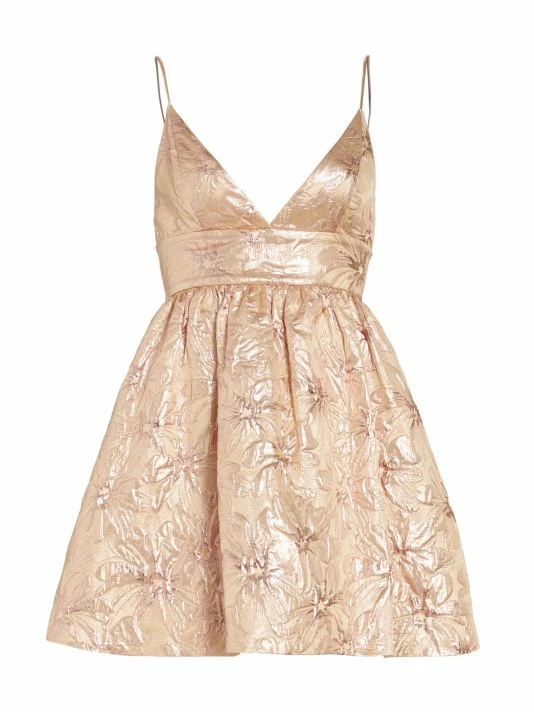 This billowy minidress sports a sharp V-neckline finished with a shiny floral brocade design, banded at the waist for added structure.