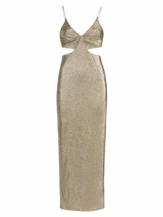 This shimmering slim-fit dress features wrap-around cut-outs at the bodice and a gathered detailed at the neckline.