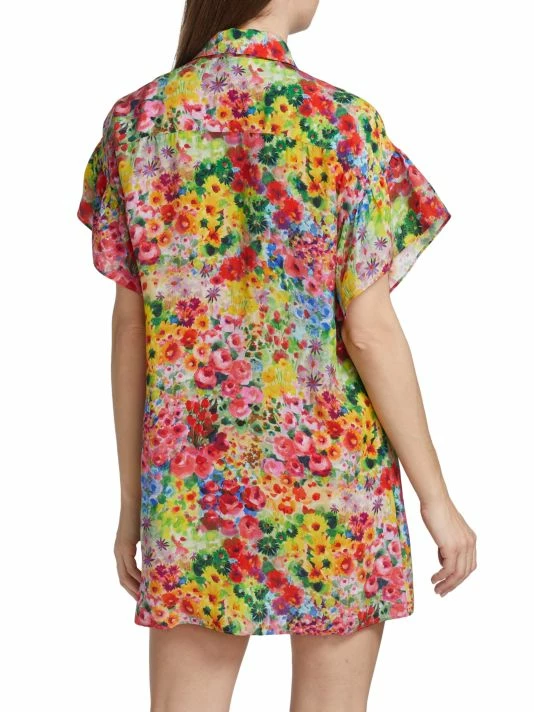 Alice + Olivia’s Jude shirtdress showcases a vibrant painterly floral print and is styled with flutter sleeves, a spread collar, and a relaxed shift silhouette.
