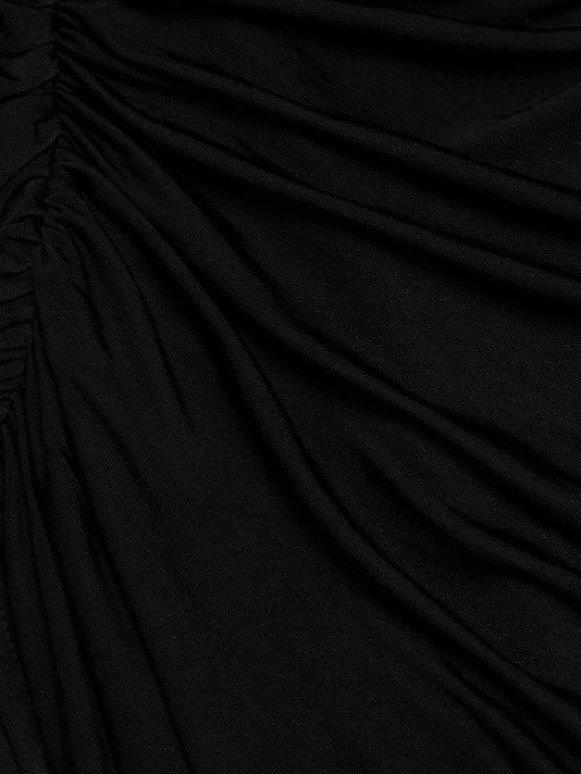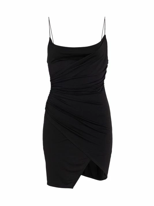 Alice + Olivia’s Katey minidress features a draped bodice with an asymmetric hem. This fitted style is complete with a deep cowlneck and delicate spaghetti straps.