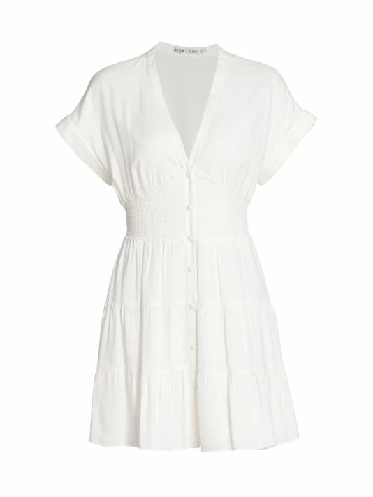 Breezy minidress with cuffed sleeves, featuring a smocked empire waist and shirred details.