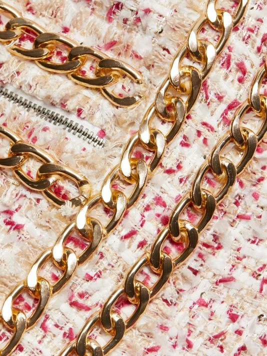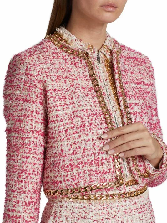 Alice + Olivia’s Kidman cropped tweed jacket features a round neck and an open front. Goldtone chain trim elevates this classic silhouette.