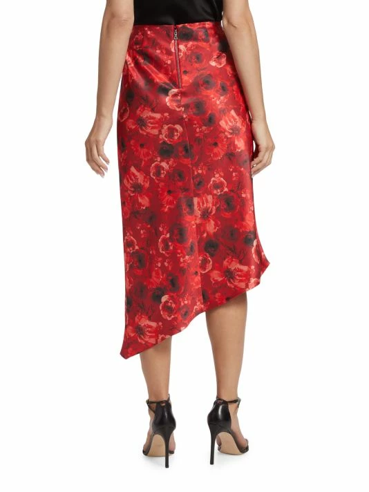 ONLY AT SAKS. Cut with an edgy asymmetric hem, Alice + Olivia’s Maeve midi-skirt boasts a slinky slip silhouette. This style is adorned with bright florals and features a side slit for added movement.
