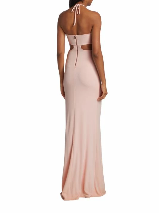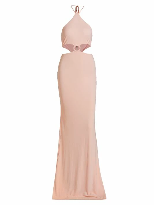 Alice + Olivia’s Marguerite maxi dress features a halterneck and wraparound side cut outs. A center O-ring detail and an exposed back zip closure finish this sleek style.