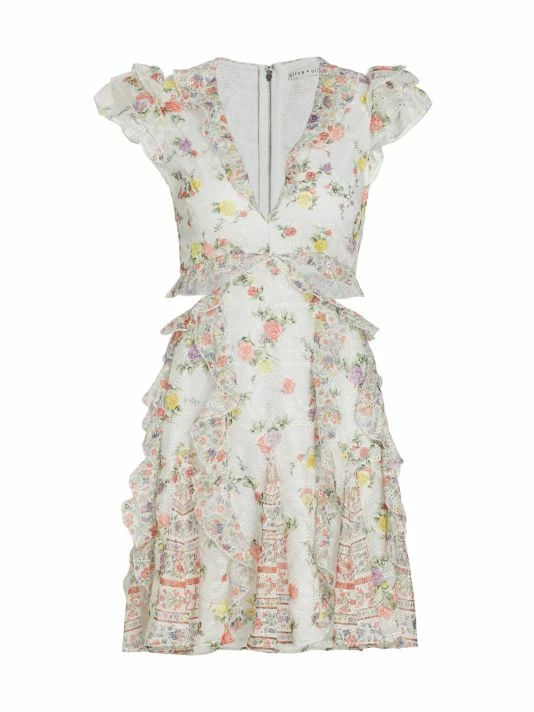 Made of floral printed ruffle fabric, the Mitzi minidress by Alice + Olivia is finished with a cut-out waistline.