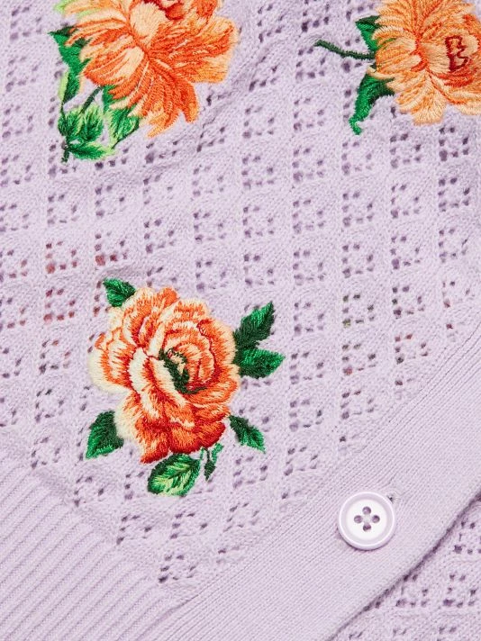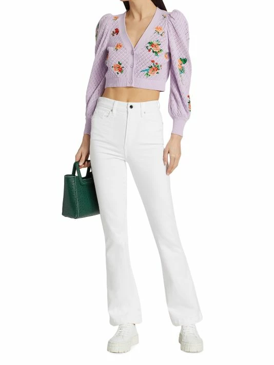 Alice + Olivia’s Morita cardigan features a cropped silhouette with voluminous puff sleeves. This pointelle style is embellished with bright, embroidered floral patches.