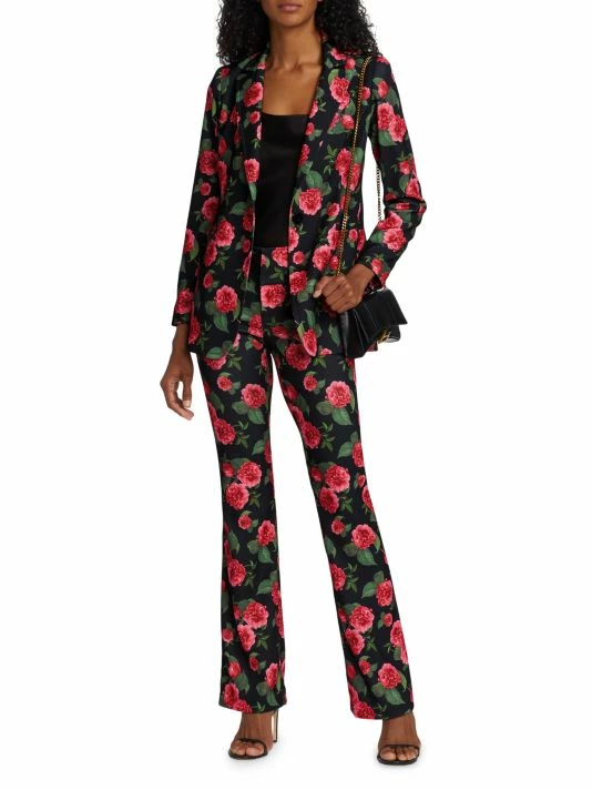 The Olivia trousers from Alice + Olivia feature a slim fit through the hip and thigh that tapers into a slight flare leg. A wide waistband and a romantic rose print complete this polished style.