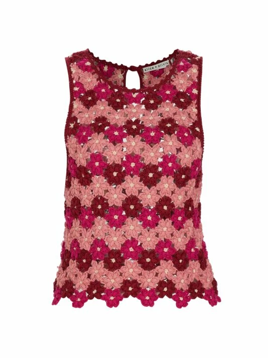 Crafted of crocheted cotton, Alice + Olivia’s Reva shell top is detailed with a round neck, keyhole back, and floral pattern.