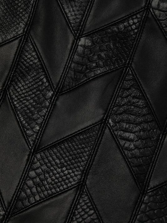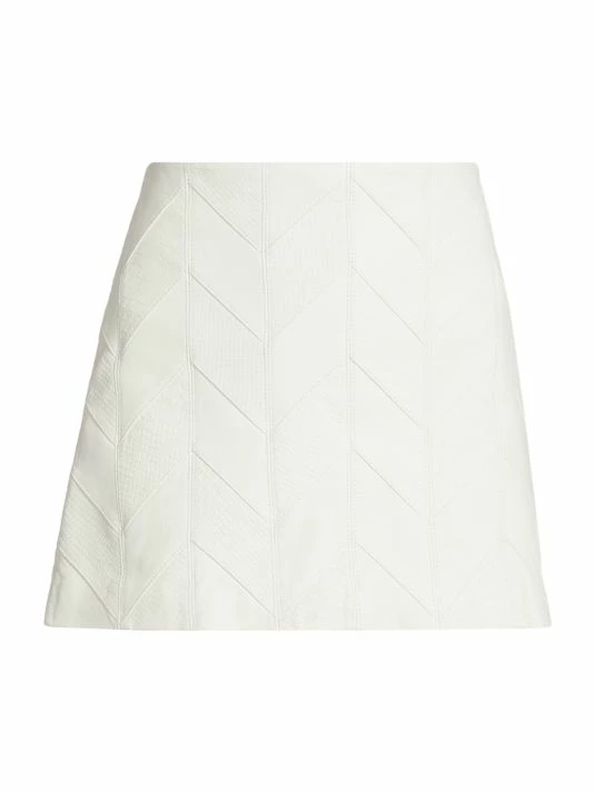 Crafted of luxe lamb leather, Alive + Olivia’s Riley miniskirt boasts textured chevron and crocodile-embossed patterning.