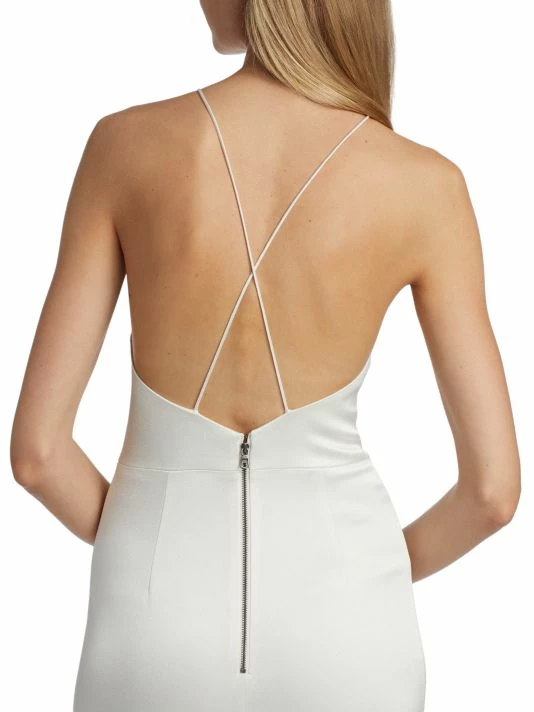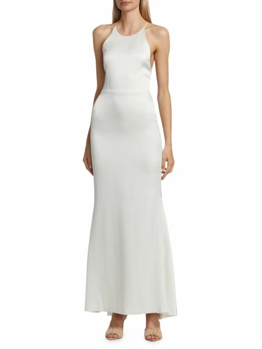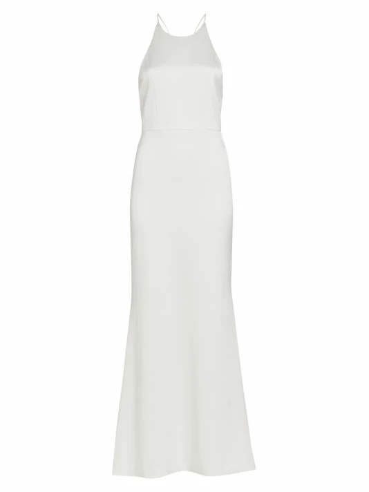 Alice + Olivia’s Samia gown is crafted of lustrous satin. Featuring a low back, this elegant style graces the body with a round neck, crossover spaghetti straps, and mini train detail.