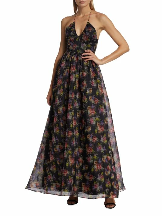 Crafted of silk, Alice + Olivia’s Saori princess gown is adorned with a playful floral print. This full-skirted style is complete with a plunging V-neck and a halter-tie.