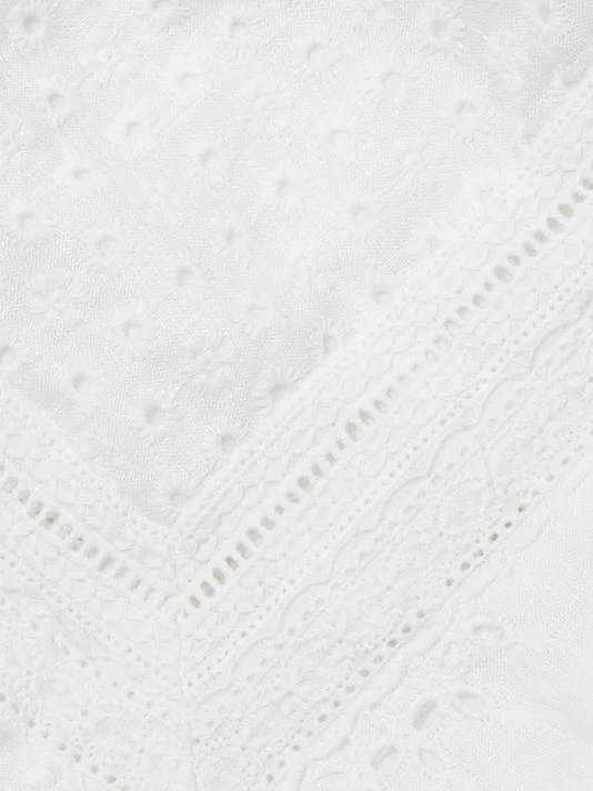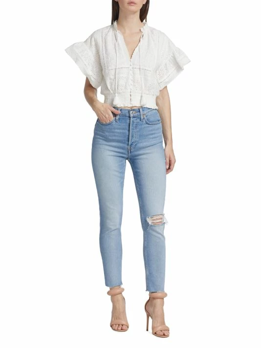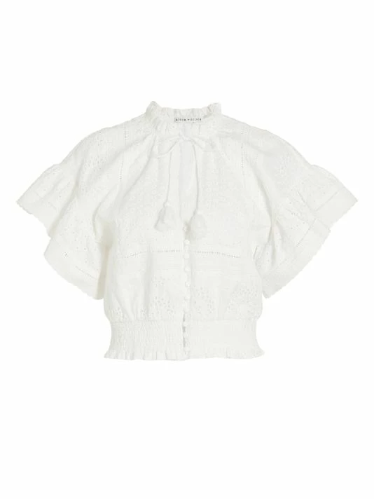 Alice + Olivia’s Tabitha blouse is adorned with eyelet embroidery, flutter sleeves, and tassel ties at the neckline.