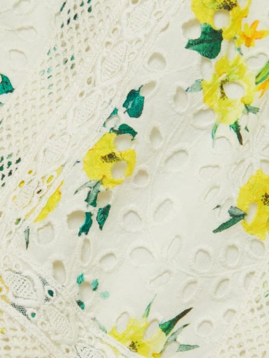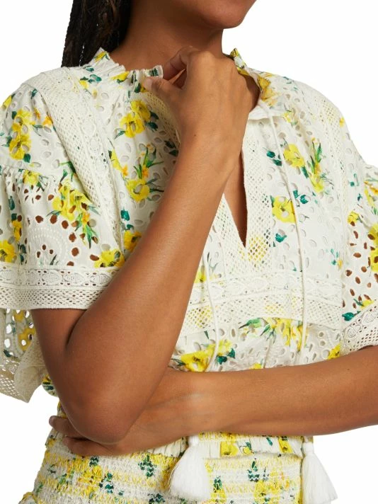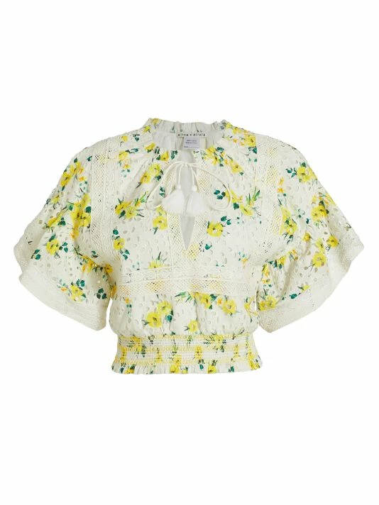 Crafted of floral-print eyelet lace, Alice + Olivia’s Tabitha blouse features a split neck with a tie detail and short flutter sleeves. Crochet-lace trim and a smocked waistband finish this cropped style.