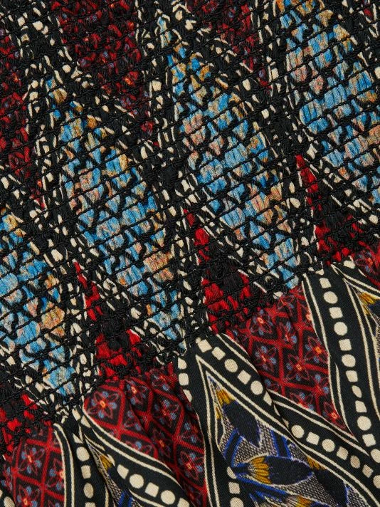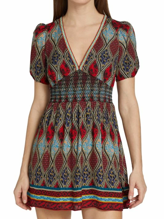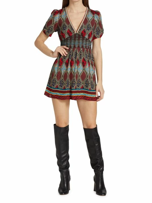 This minidress is made of multi-print fabric with short puff-sleeves.