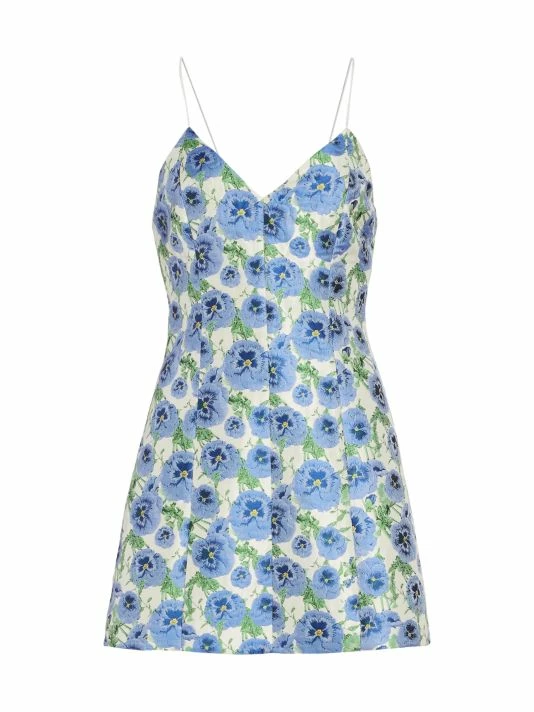 Irises cover this jacquard mini dress, designed with a strappy silhouette and darting for shape.