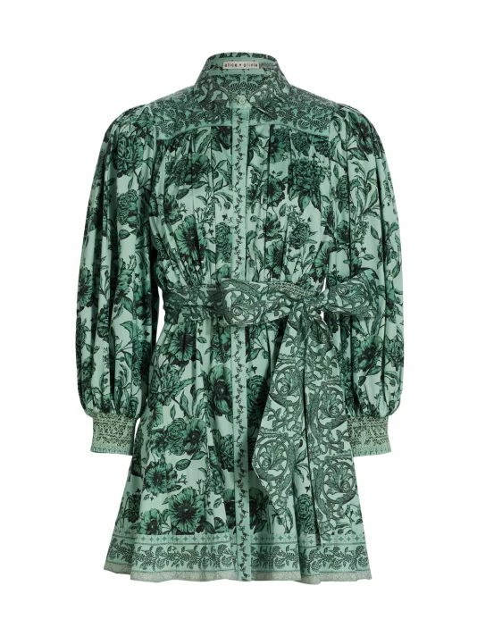 Alice + Olivia’s Tiffie minidress is adorned with an ornate floral print. Designed with a self-tie belt, this button-front style features blouson sleeves and smocked cuffs.