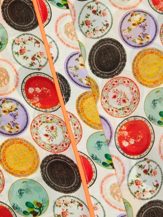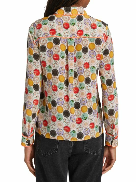 Alice + Olivia’s Willa shirt is adorned with a floral medallion print with contrasting piping.