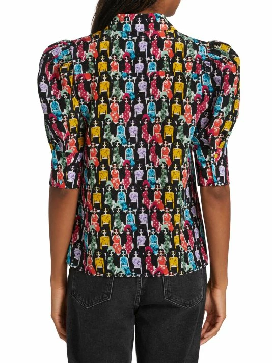 The Willa shirt from Alice + Olivia is adorned with a multicolor print with bold puff sleeves.